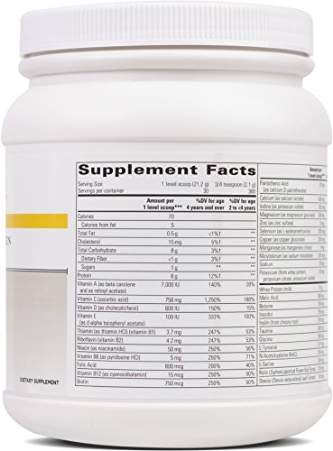 Mega MultiVitamin Powder Mix is a dietary supplement designed to conveniently supply 100 percent or more of the Recommended Daily Allowances of most essential vitamins and minerals. Featuring a combination of 23 vitamins and minerals, this formula contains protein, amino acids, fiber, calcium and antioxidants to support optimal health and energy levels. Mega MultiVitamin was designed for the person who needs a complete multivitamin in a delicious, versatile powder mix. Includes potent antioxidants- lutein, zeaxanthin, and N-acetylcysteine. Especially rich in L-cysteine and L-glutamic acid, two amino acids which are precursors of the antioxidant glutathione. Also supports healthy immune system functioning. Includes inulin, a fiber source that also promotes calcium absorption. Great for kids also.