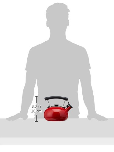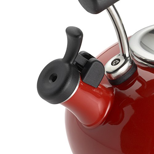 A contemporary and stylish handle supported by cast stainless steel arms provides a secure comfortable grip. The fashionable red colored exterior is stain resistant and easy to clean. The convenient whistling feature signals when water is at a boil. Lifetime Limited Warranty