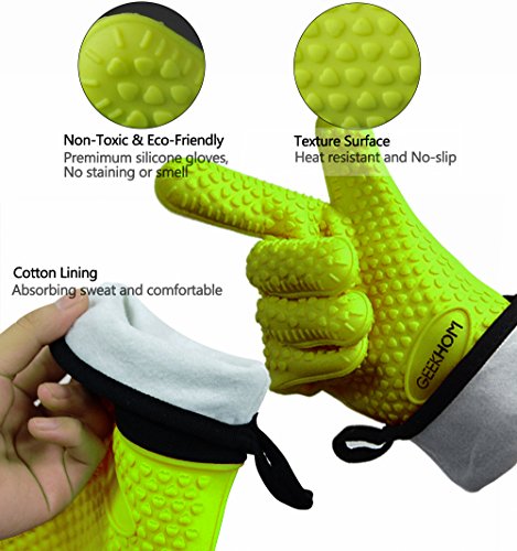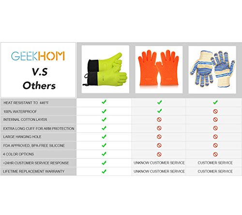 - FULL GEEKHOM WARRANTY - Provides 100% no questions asked money back guarantee. If you’re not completely satisfied with your silicone grill gloves purchase simply let us know, and you'll be offered a FULL refund or replacement! Enjoy this absolutely RISK FREE purchase today by clicking the yellow 'Add to Cart button' above.