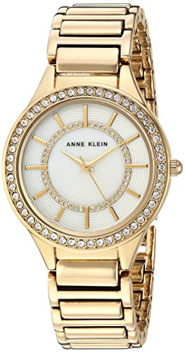 -. Binding : Watch -. Brand : Anne Klein -. Color : Gold -. Department : womens -. EAN : 0086702590193 -. Feature : Bezel set with 50 clear Swarovski crystals; mineral crystal lens; mother-of-pearl dial with gold-tone hands and markers; inner ring accented with glitter filling / Gold-tone adjustable link bracelet; jewelry clasp and extender / Japanese-quartz Movement / Case Diameter: 32mm / Not water resistant -. Label : AK Anne Klein -. Manufacturer : AK Anne Klein -. Model : AK/2722MPGB -. MPN : AK/2722MPGB -. PartNumber : AK/2722MPGB -. ProductGroup : Watch -. ProductTypeName : WATCH -. Publisher : AK Anne Klein -. Studio : AK Anne Klein -. Title : Anne Klein Women's Quartz Metal and Alloy Dress Watch, Color:Gold-Toned (Model: AK/2722MPGB) -. UPC : 086702590193