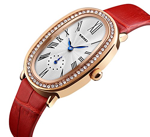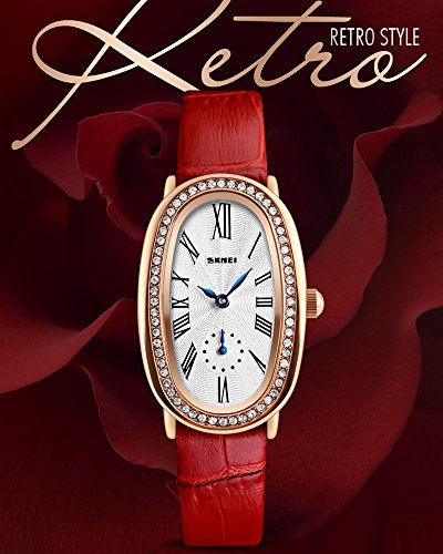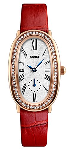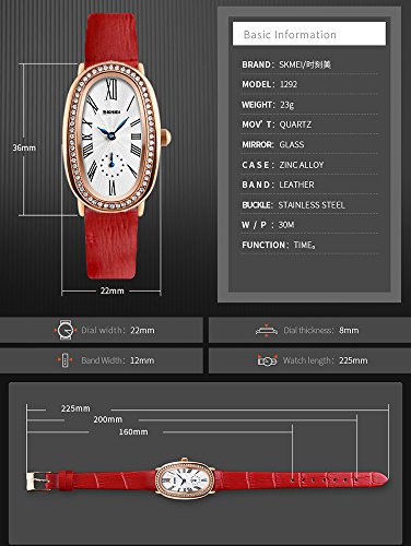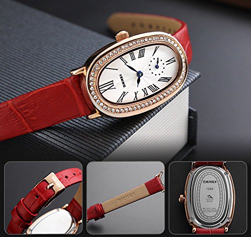 Fashion and attractive appearance:the unique oval dial design with the crystal diamond,roman numeral with blue pointer,and the red leather band,bring you a pleasure mood.