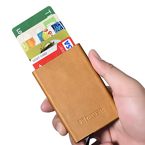 -. Feature : ☆ [GENUINE LEATHER & ALUMINUM] 100% genuine cowhide surface leather with purely handmade by innovative and luxurious design. Every piece of leather has its unique veins and pores. Internal aluminum can also be very good protection to prevent distortion. / ☆ [SECURITY&SAFETY] ICARER Automatic Pop-up RFID Protection Card Case Holder can perfectly block unwanted RFID scanners, includes RFID blocking technology to prevent unauthorized access to personal information(ID cards,credit cards and more) / ☆ [EASY ACCESS TO CARD] The case is a unique slim organizer that quickly and neatly gradually slides your cards out with one click.With a click all cards slide out gradually. The cards will not fall out and is a perfect card case. / ☆ [LARGE CAPACITY] Holds approximately 10 business cards or 6 credit cards depending on the thickness of your business card. Fits comfortably in your front pocket, purse or briefcase.Store your business cards, cash, credit cards, and gift cards in true style with this sleek card case.Professional design is to protect and organize your cards. / ☆ [LIGHT-WEIGHT DESIGN] Simple fashion appearance is free to lift the lid of the business card box impression.On the other hand the compact card case allows you to bring it along in your jean pocket,handbag, backpack.More durable and convenient for the everyday commuter or traveler.