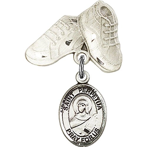 -. Title : Sterling Silver Baby Badge with St. Perpetua Charm and Baby Boots Pin 1 X 5/8 inches