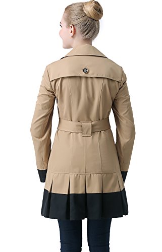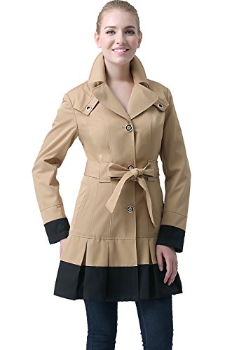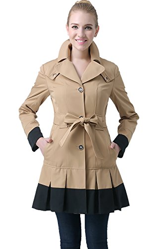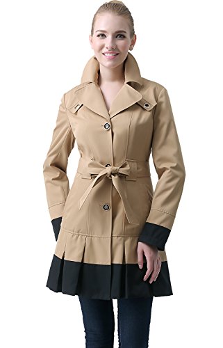 Flattering pleats at hem add swingy style to a classic single-breasted trench coat topped with a detachable hood and wrapped with a tunneled tie belt. Storm flaps and a sophisticated colorblocked hem and cuffs complete the design.Feature