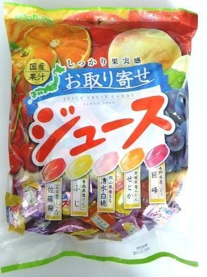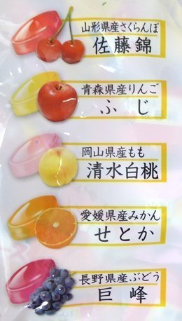 原材料:砂糖、水飴、佐藤錦果汁(山形県産)、ふじ濃縮果汁(青森県産)、巨峰濃縮果汁(長野県産)、せとか果汁(愛媛県産)、清水白桃果汁(岡山県産)/酸味料、香料(オレンジ由来)、着色料(アントシアニン・アナトー・カラメル・クチナシ)