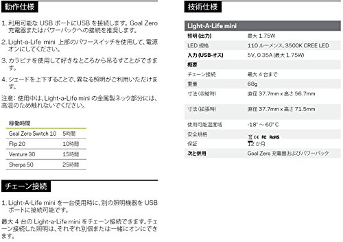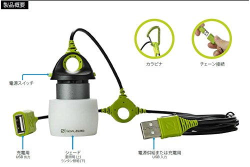 Bright mini USB light with 110 Lumens, and collapsible diffuser for lantern or area light. Chainable LED light that pairs perfect with any Goal Zero recharger. Plus additional colored shades can be purchased to fit any adventure.