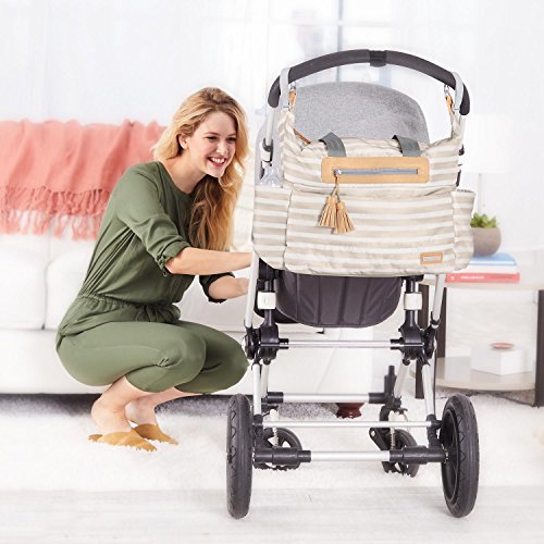 - Hangs neatly on a stroller with the included stroller straps