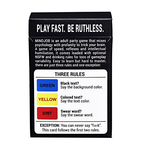 DERIVED FROM SCIENCE. ACADEMIC, IT IS NOT.MINDJOB is an adult party game that uses conflicting visual and verbal cues to mess with your mind.