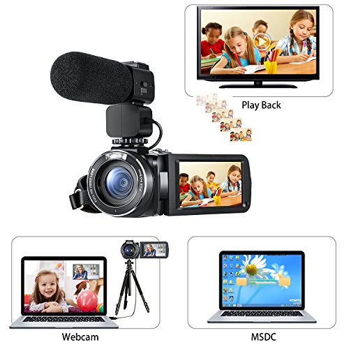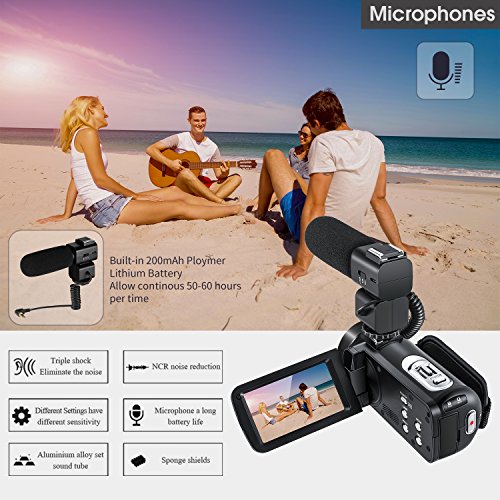 Video camcorder with professional 2 in 1 HD 72mm 0.39x super wide angle lens (w/ macro lens portion), shooting wider view and a high-quality upgrade-version rechargeable shotgun microphone, noise canceling effectively, to enhance sound quality.