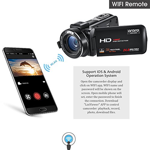 Built-in WiFi, open the camcorder display and click on WIFI, name and password will be shown on the screen, use phone or table open wifi, enter the password to finish the connection. Download "LzxViewer" APP first and open it to control camcorder: playback, record, photo, download files. WiFi Effective range ≤ 9.8 feet.