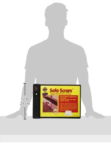 Sofa Scram Sonic Scat Pads Instantly activated by the touch of a paw, the battery operated Sofa Scram emits startling 85 decibel beeps that get pets off the furniture fast! Pet owners love the Sofa Scram because it works quickly and effectively without applying shock or pain to your pet. The Sofa Scram works as quickly and effectively as a static shock mat for about 1/2 the price. Because the Sofa Scram is non shock it will not hurt your pet. The Sofa Scram is made of attractive, easy to clean black nylon exterior. Measures 2 in. H X 12 ft. W X 59 in. L. Use the Sofa Scram on chairs, counter tops, beds, in front of doorways, trash cans and of course, it works great on the sofa.Feature