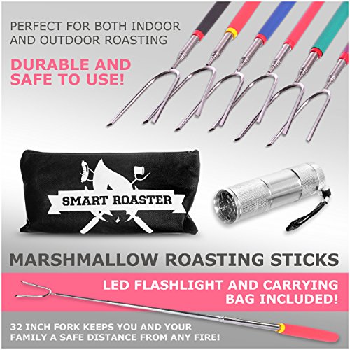 LONG TELESCOPIC STAINLESS STEEL MARSHMALLOW ROASTING FORKS FOR EASY ROASTING! Our handy set of 6 Marshmallow Roasting Sticks are perfect for both indoor and outdoor roasting! 32 inch fork keeps you and your family a safe distance from any fire - Cook hot dogs and even kebabs too!
