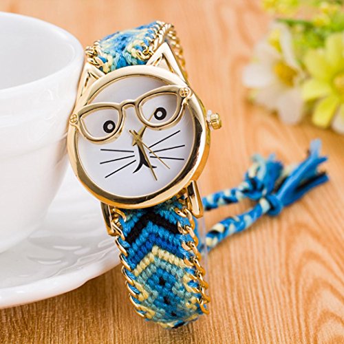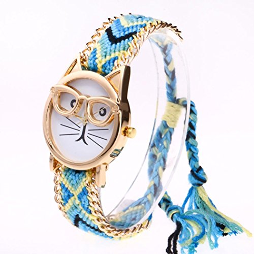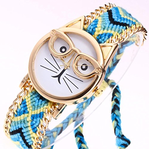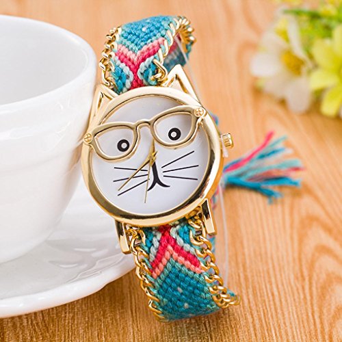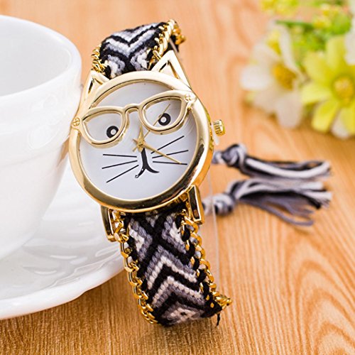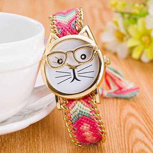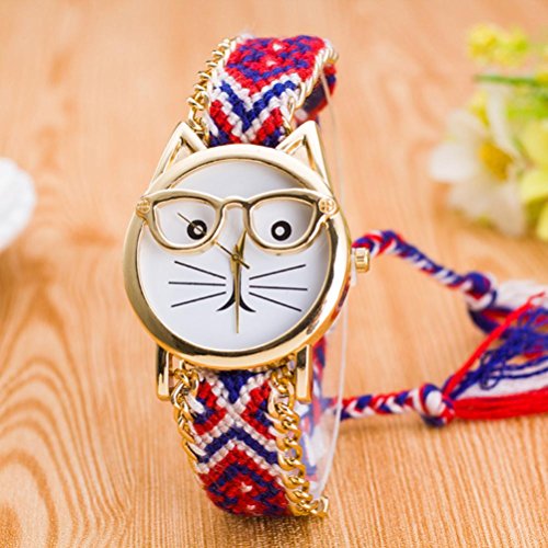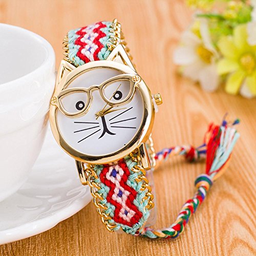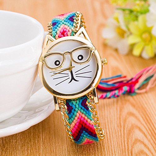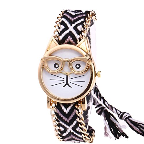 -. Title : SINMA Casual Glasses Cat Watch Knitted Weaved Rope Band Wristwatch Analog Quartz Dress Wrist Watches