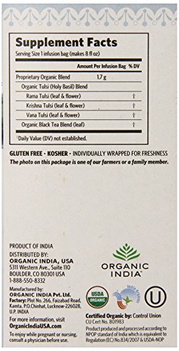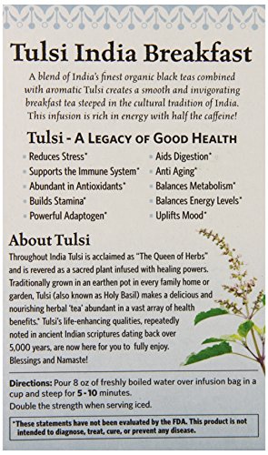 -. Binding : Grocery -. Brand : ORGANIC INDIA -. EAN : 0801541500062 -. Feature : Pack of six, 18 Counts (total of 108 Count) / Reduces stress, Stress relieving, Soothing and relaxing / Abundant in antioxidants / Uplifts mood / Gluten free -. IsAdultProduct : 0 -. Label : Organic India -. LegalDisclaimer : Note: This Product Description Is Informational Only. Always Check The Actual Product Label In Your Possession For The Most Accurate Ingredient Information Before Use. For Any Health Or Dietary Related Matter Always Consult Your Doctor Before Use. -. Manufacturer : Organic India -. MPN : 00220711 -. NumberOfItems : 6 -. PackageQuantity : 6 -. PartNumber : 00220711 -. ProductGroup : Grocery -. ProductTypeName : GROCERY -. Publisher : Organic India -. Size : 18 BAG -. Studio : Organic India -. Title : Organic India Tulsi India Breakfast Tea, 18 Count (Pack of 6) -. UPC : 801541500062