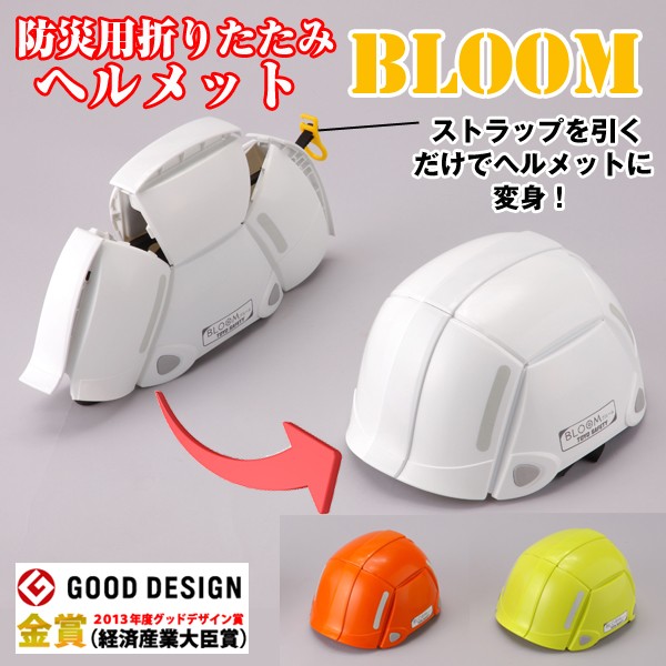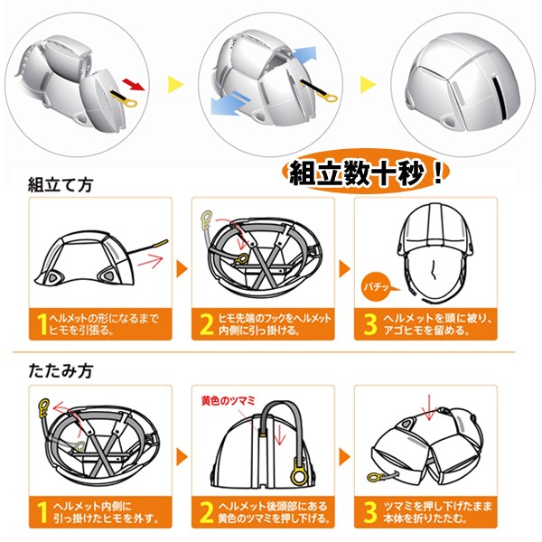 すぐ取り出せる、コンパクト折り畳み式ヘルメット! ぱっとストラップを引くだけで組立完了!素早くかぶれる!地震列島・日本。 東日本大震災以来ここ数年も、大きな地震が頻繁に起こり、日本国中不安な毎日。 また、大雨による土砂災害など自然災害は我々人間にとって脅威なこと。いつ起こるともわからない地震、災害の為、必要最低限の災害予防を自分で備える必要性が高まっています。そこで、おすすめしたいのが、ヘルメット。上からの落下物から身を守ることはとても大切です。しかも折りたたんでコンパクトに備蓄できる優れた商品です。本来ヘルメッは頑丈で大きく収納場所も占領しがち。非常袋にも入れずらいものです。しかし、これは付属のストラップをパッと引くだけで、わずか数秒で組立完成する折り畳み式ヘルメットなのです。頑丈な強度はそのままに、折り畳んで保管できるので、押し入れの隙間や本棚など有効活用して保管できます。カラーも3色。ホワイト、オレンジ、ライム。家族でカラーを変えたり、1人に1つ備えたいですね。 ■商品サイズ:頭囲52~61cm