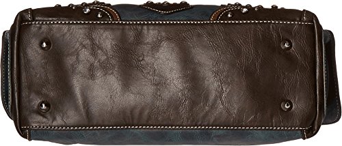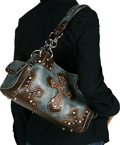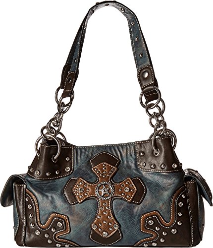 Update your western look carrying this hip Blazin Roxx satchel This women's handbag features main top compartment and two side compartments -- perfect for storing your cell phone Women's handbag is designed with cross applique, silver-tone studs and glitzy rhinestones. Dual top snap closures. Interior boasts middle zipper pocket, side zipper pocket and two open pouch pockets. Exterior zipper pocket at back. Bag measures 13 1/2" x 8" x 4 1/2". Imported.Feature