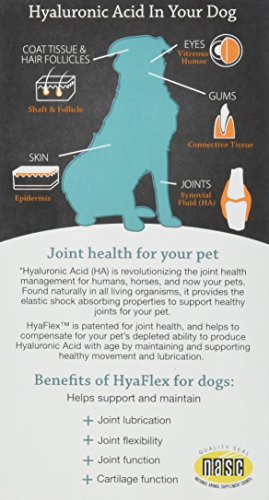 HyaFlex is Hyaluronic Acid (HA) in solution for oral administration. The Hyaluronic Acid in HyaFlex is one of the highest in molecular weight. HyaFlex Oral HA helps to support your pet's joints, skin, eyes and gum health. Hyaluronic Acid is naturally produced by the body and is a constituent of synovial fluid that cushions and lubricates the cartilage between the joints. As your pet ages, their body produces less and less HA and it becomes more and more difficult to replenish and the cartilage and other structures of the joint begin to need support. Joints become less flexible and movement is limited. HA supplements pick up where their bodies fail them. The HA in HyaFlex helps to support joint movement and cushioning. If we compare the joints of your pet's body to an automobile engine, the joint fluid in their body mimics the oil in a car engine. At regular intervals we replace the oil in our car engines because the heat and friction breakdown the oils viscosity. The oil becomes thinner and less able to protect the metal surfaces from excessive wear. Hyaluronic Acid and the synovial fluid acts the same way in our joints. As your pet ages, the viscosity of their joint fluid breaks down and becomes thin and is unable to cushion the joint and the cartilage. This leads to increased friction on the cartilage surfaces of their joints. Taking HyaFlex helps maintain the normal viscosity of the joint fluid. Add one (1) ml (full dropper) one time daily or as recommended per body weight to the food.Feature