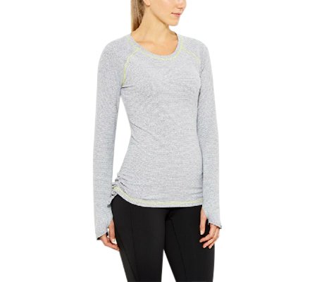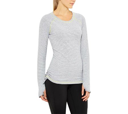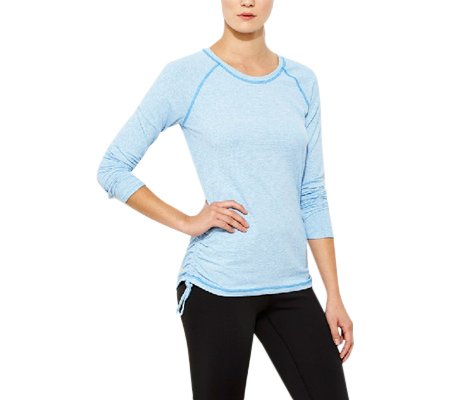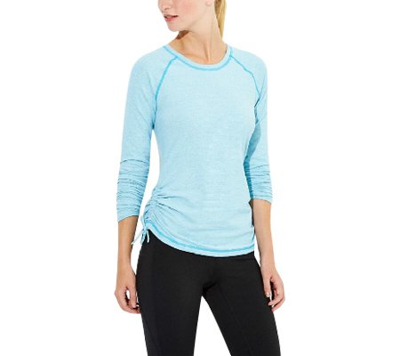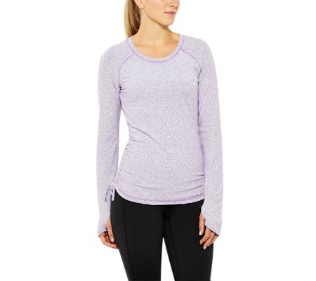 This top's soft wicking fabric & ruched details make it a fun, cozy layer for your run around the track or around town.