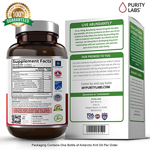 -> 100% pure krill oil is free of extraneous fillers, binders, artificial ingredients, potentially harmful preservatives or GMOs. Our supplements are always formulated in GMP certified facilities and subjected to stringent third party purity testing to guarantee you know exactly what you put into your body and that it is safe.