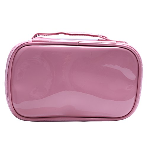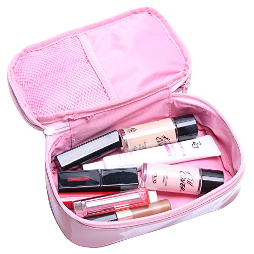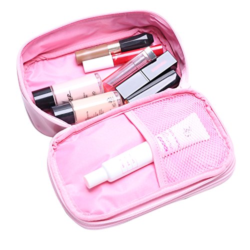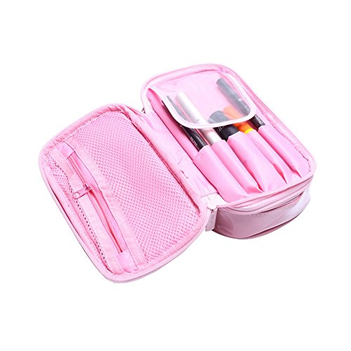 -. Feature : Compact cosmetic bag will organize your beauty accessories cleanly in place. Many pockets and places to collect almost 20 all kinds of makeup brushes and a few small makeup essentials like: mascara,finishing powder, eyeshadow, pallette,lipgloss,lipstain,eyeshadow,eyeliners,P.R.Imer,makeup wipes,pressed powder,blush and contour. / Come with STYLISH ; Size: 20.5*12.5*9cm.Dual zipper opening for simple access to your makeup essentials and a zipper pocket outside to keep most often used makeup essentials. Slots and wide elastic strap on the inside of the lid help to keep brushes accessible / 2 zippered layer with 4 separeted room to help keep your different makeup essentials organized. / There is a portable mesh pouch in the middle. A flexible strap allows for the belt to be easily worn around the waist or over the shoulder.High quality nylon fabric, broad carry handle, fine quality zipper make your makeup bag durable and comfortable to use. Many of the customers are especially satisfied with this feature. / This pink cosmetic bag is ideal for everyday use or for journey. It is sufficiently large to fit all of your makeup while still staying small enough for convenient travel or to carry in your everyday bag. It's beautiful design includes a matching pink zipper closure on top and pink handles.