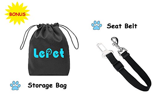 -. Feature : Waterproof pet seat cover 54" x 58" to keep your car LEATHER and UPHOLSTERY from claws, paws, spills, hair and dander while your pets take car rides. / LePet dog seat covers for cars made with high quality waterproof oxford fabric for durability and comfortability, protecting your car backseat perfectly from water, drink, spill, milk moisture etc. Retaining its shape and provides enough thick resistance against dog's nails/paws. / Stain-proof Pet Seat Covers: Seat belt buckles opening and Velcro closure for it can prevent dogs, pets, or humans mess up backseat leather from crumbs of cereal, snacks, fruit, dander, dirt etc. / DOG BACK SEAT HAMMOCK style not only protects the back seat but it also protects the backs of the front seat and the center console / Very Easy To Install. Just Snap the Buckle Straps Around Your Headrests and Tuck In The Seat Anchors.Very Easy to Clean - Machine Washable: Use Gentle Cycle