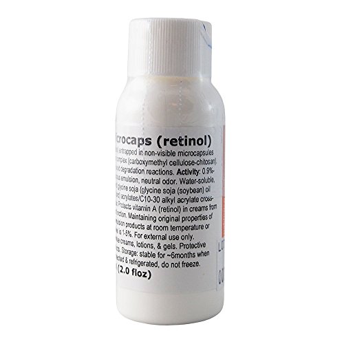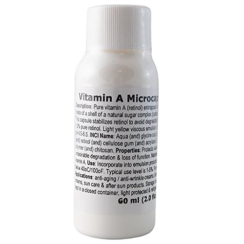-. Feature : Vitamin A (Retinol) in Microcapsules for Sustained Activity / Item is non-returnable. Not a finished cosmetic product. Consists of raw materials / Used as ingredient for personal care products (typical concentration: 1-5%) / INCI Name: Aqua, glycine soja, retinol, cellulose gum, acrylates/ c10-30 alkyl acrylate crosspolymer, chitosan, glycolic acid, polysorbate 20, sorbitan oleate, BHT / CAS: 7732-18-5, 8001-22-7, 68-26-8, 9004-32-4, 9012-76-4, 79-14-1, 9005-64-5, 1338-43-8, 128-37-0