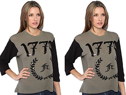 -. Feature : Wildfox Couture The 1774 Sequin Campfire Tee in Militant (Small) / The Wildfox 1774 Sequin Campfire Tee in Militant is a vintage-inspired gem. / Constructed from a soft lightweight cotton blend, this garment is a crew neck top with contrasting 3/4 length sleeves and a swing bottom hem. / . Its ornate sequin embroidery with the "1774" P.R.Inted design gives the tee its finishing touch. / Fabric: 90% Cotton / 10% Spandex