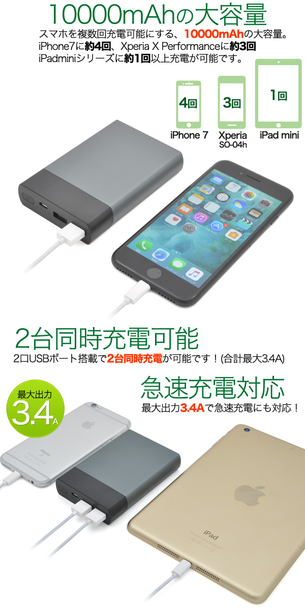 スマホを複数回充電可能にする、10000mAhの大容量。iPhone7に約4回、Xperia X Performanceに約3回、iPadminiシリーズに約1回以上充電が可能です。 microUSBケーブルも付属します。