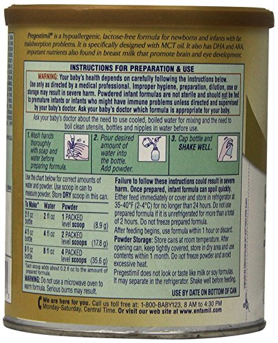 Pregestimil® is designed for infants age 0 - 12 months who experience fat malabsorption and who may also be sensitive to intact proteins. Fat malabsorption or steatorrhea may be associated with cystic fibrosis, short bowel syndrome, intractable diarrhea, and severe protein calorie malnutrition. Pregestimil is also appropriate for infants with galactosemia. Features: • Hypoallergenic and Lactose-free • 55% of the fat from MCT oil • Designed for infants with fat malabsorption problems • Ready-to-use is virtually isotonic • Includes our blend of DHA and ARA, nutrients also found in breast milk, that promotes brain and eye development. Calories: 500/100g.Feature