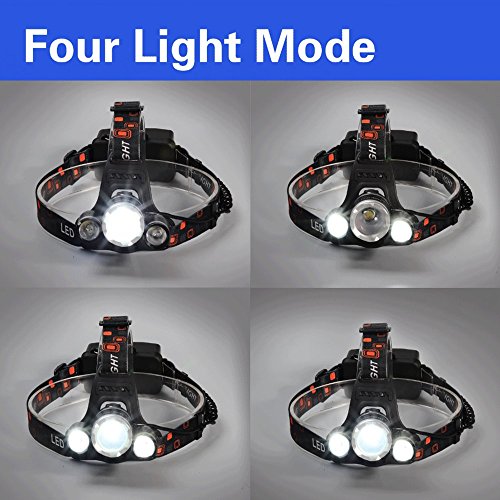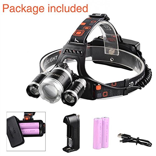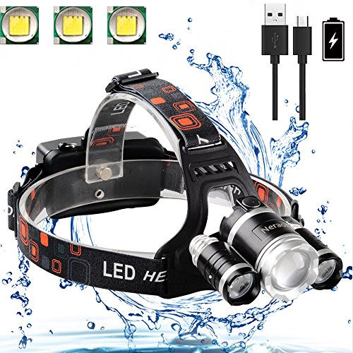 Neraon Brightest 3 Cree T6 LED Headlamp, 6000 Lumens Zoomable LED Headlamp, 3 Light 4 Mode USB Rechargeable 18650 battery (4 Charging ways), Waterproof Head Light for Outdoor Running, Camping, Hiking.