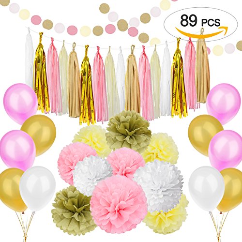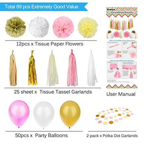 89 pcs Gold Pink Party Decorations Kit SIMPZIA Party Supplies Including Paper Pom Poms Flowers& Tissue Tassel Garland &Party Balloons for Party Decor,...