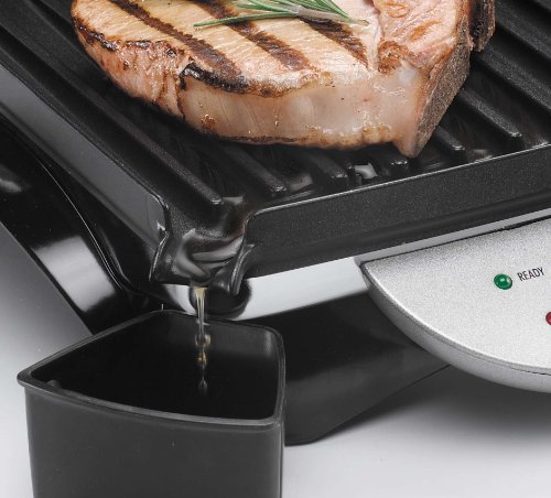 - Feature : Fast, even grilling and toasting with double-sided contact cooking plates / Accommodates food of any size with the height adjustable hinge; easily grill meat, fish and panini sandwiches / Precise, customized grilling and toasting with the adjustable thermostat and easy-view temperature range window / Healthier and better-tasting food with a slightly tilted grill surface; channels drain away grease and oil into a separate cup / Easy-to-clean with non-stick grill plates and oil/grease drain cup; simply wipe the grill plates and empty the cup