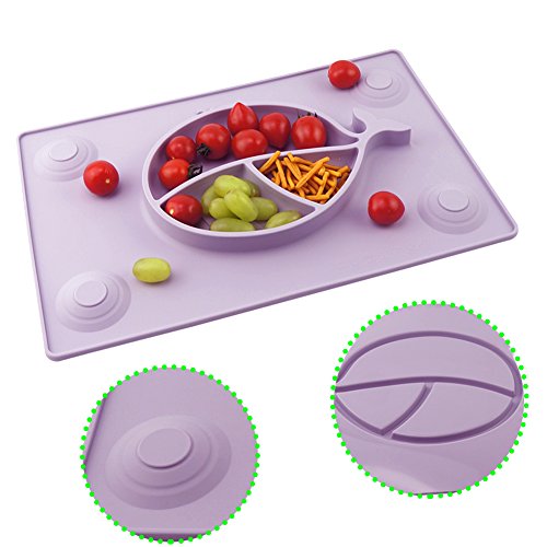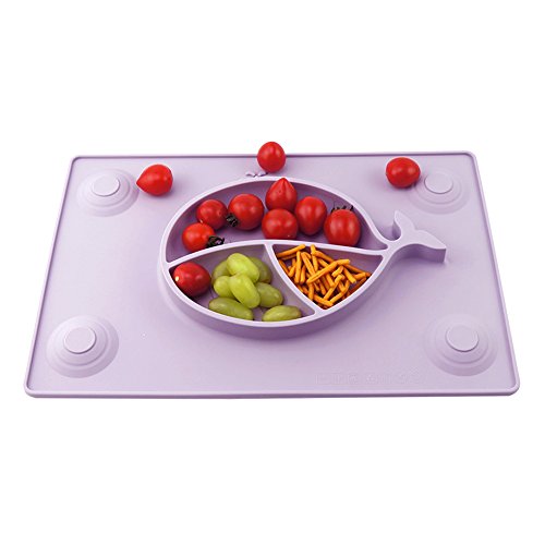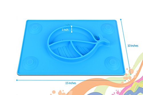 -. Feature : Strong Suction Cup Bottom - Enjoy less mess with a silicone children's placemats that provides a suction cup base for better stability, raised food sections, and a large mat to catch spills or accidents. / Healthy Transitions - The KiddyByte silicone food mat is made for girls and boys moving from bottles to baby food purees, finger foods, and solid snacks. / Cute, Colorful Whale - More than just an innovative 3-section dinner mat, this adorable kid's food tray is shaped like a whale to give kids a cute dinnertime buddy. / Safe & Durable - Made from BPA-free, food-grade silicone, these dishwasher-safe placemats are flexible, odor and stain resistant, and tear and puncture resistant. / Complimentary Travel Bag - Simply place your silicone placemat in this zip-lock travel bag for fuss free transport.