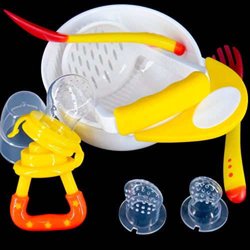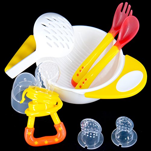 Baby & Toddler Fruit Feeder / Pacifier / Infant Teething Tool + Bowl + Masher + Silicone Spork And Spoon