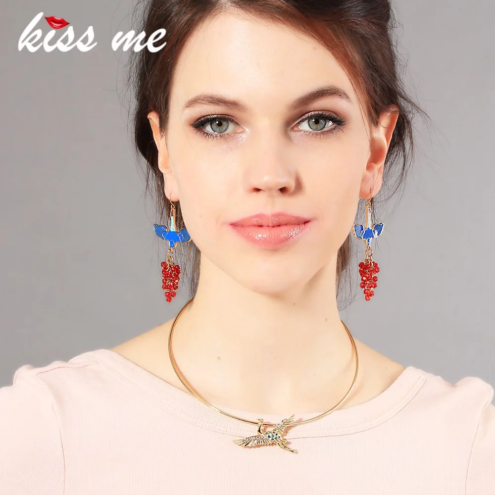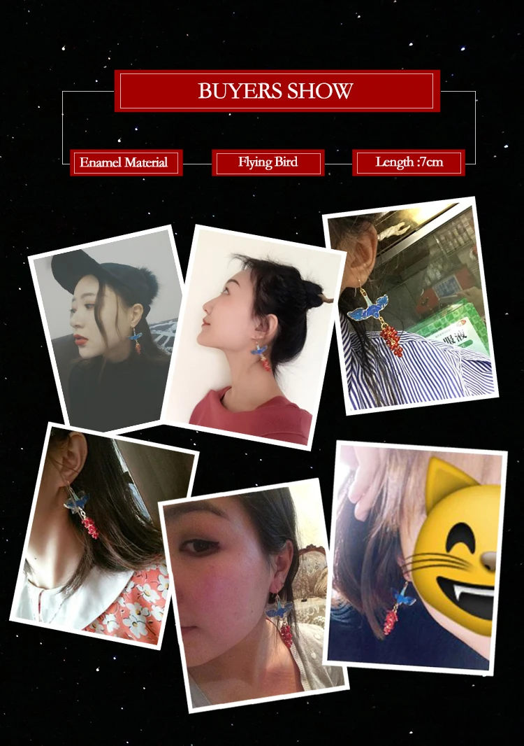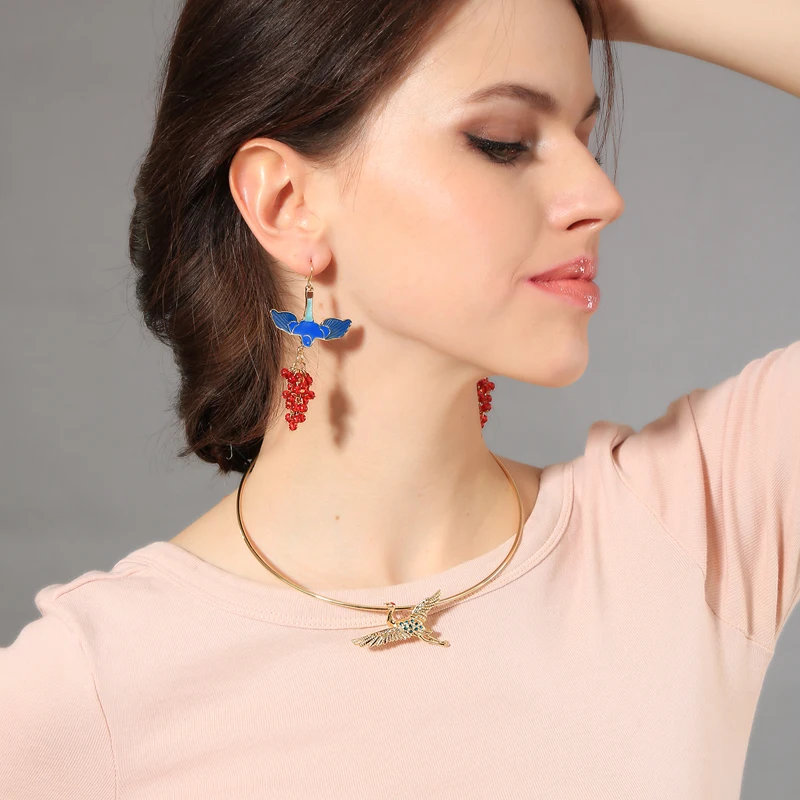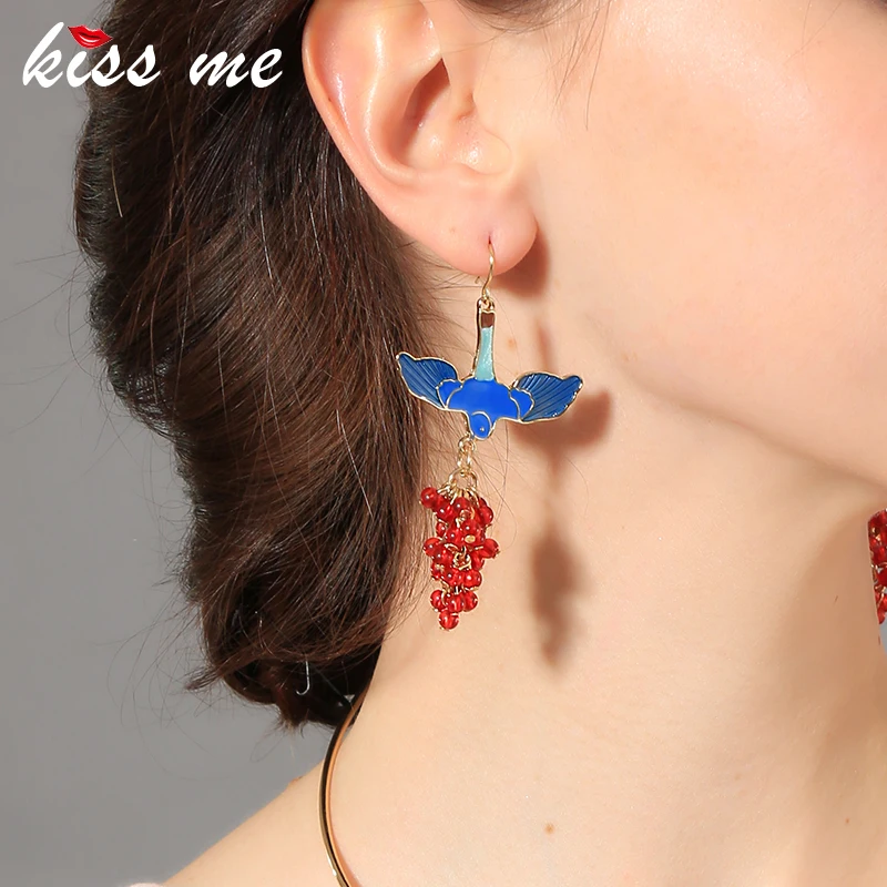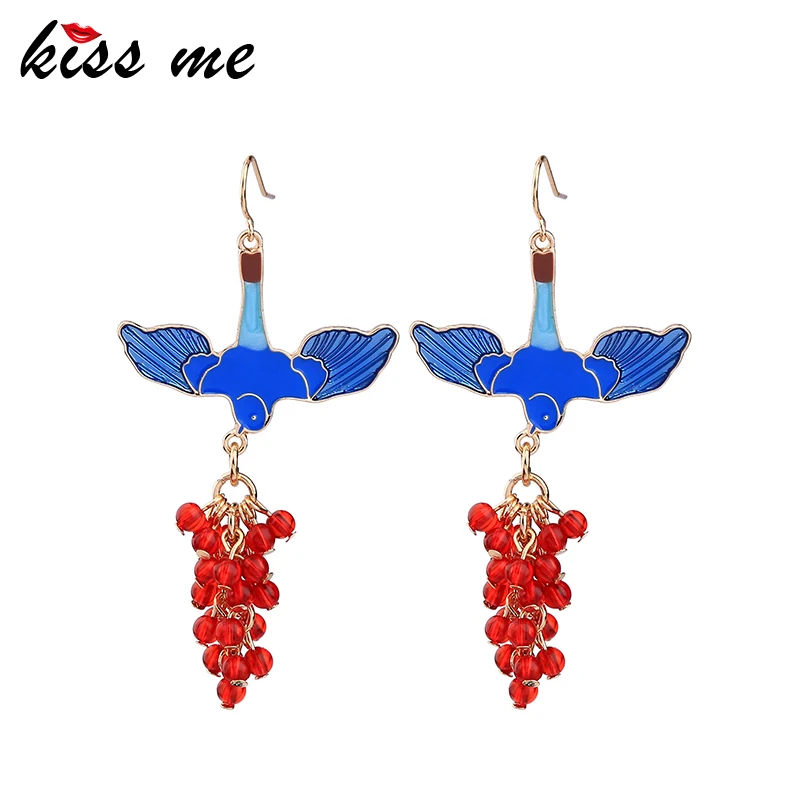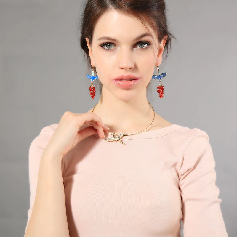 Production name ::Candy Blue Enamel Brid Red Beaded Drop Earrings for Women