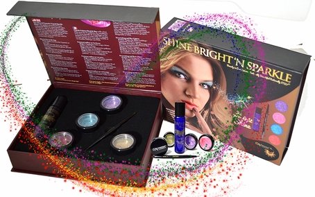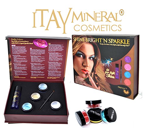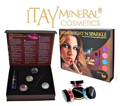 -. Feature : Shine Bright kit includes: / (4) Eyes and Face Glitter Color each 5 gram. / {1} Liquide Sparkle Gel 1 oz Blue Container Itay Mineral Cosmetics® Liquid Sparkle Bond; a water based sealer that bonds glitter, metallics, and micas to your eyelids, lips, or any other skin surface. This product is safe for sensitive skin and contact lenses. / • Itay Mineral Cosmetics® Double Sided{1} Brush, for a precise and even application. Made from top-quality, cruelty free fibers. / Itay's Mineral Glitter Powder is your secret weapon when you want that extra bit of glamour, that extra bit of sparkle, that extra knock out punch. When you really want to get noticed, that's the time for Itay's Mineral Glitter Powder.