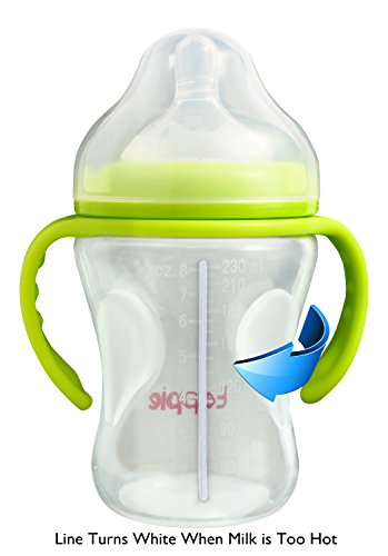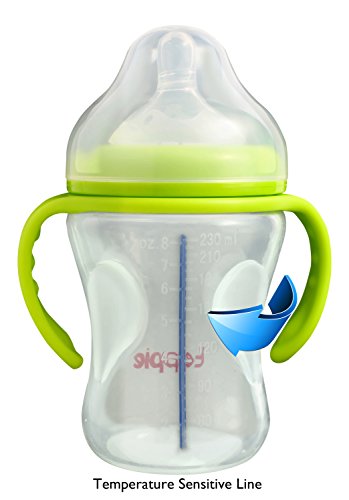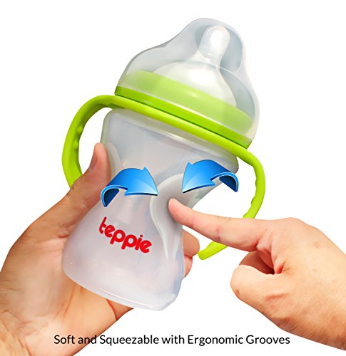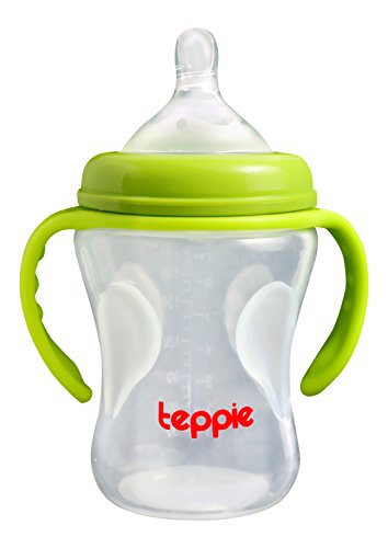 -. Binding : Baby Product -. Brand : Teppie -. Color : White -. EAN : 0646437157216 -. Feature : BPA FREE, 100% food grade silicone baby feeding bottle, does not leak / TEMPERATURE line changes from blue to white when milk is above 42 degrees Celcius / SILICONE nipple shaped like a natural breast, with a thick bottom for a comfortable suck / SOFT, squeezable, with ergonomically designed grooves for Baby's small hands / DISHWASHER, freezer and microwave safe. For babies 3 months and up -. Label : Teppie Enterprises -. Manufacturer : Teppie Enterprises -. MPN : A-1107 -. PackageQuantity : 1 -. PartNumber : A-1107 -. ProductGroup : Baby Product -. ProductTypeName : BABY_PRODUCT -. Publisher : Teppie Enterprises -. Studio : Teppie Enterprises -. Title : Teppie Silicone Feeding Bottle With Handle, Temperature Sensitive, Dishwasher, Freezer and Microwave Safe, Enhance Baby's Feeding Experience NOW! -. UPC : 646437157216