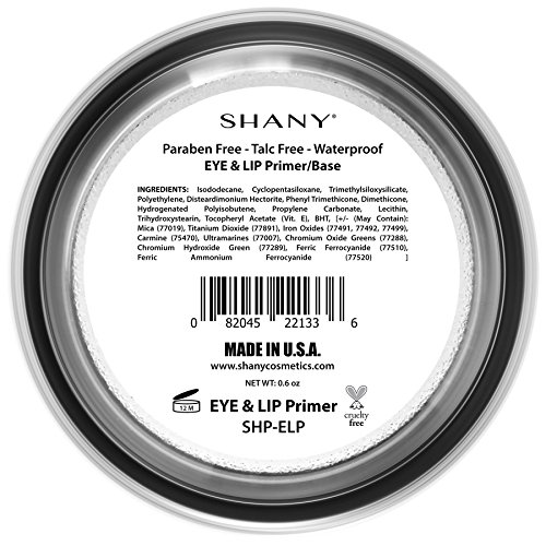 -. Binding : Health and Beauty -. Brand : SHANY Cosmetics -. Color : Peach -. EAN : 0082045221336 -. Feature : Paraben free, talc free, hypoallergenic infused with vitamins and essential ingredients / Prevent your makeup from smudging and fading by using this eye shadow base P.R.Imer / It works great on lips by keeping them smooth and showing off true color of lipstick / Helps to prevent creasing on the eye area and feathering in the lip area, waterproof / Designed and manufactured in USA - not tested on animals - proud member of PETA -. IsAdultProduct : 0 -. Label : SHANY -. Manufacturer : SHANY -. MPN : SHP-ELP -. NumberOfItems : 1 -. PackageQuantity : 1 -. PartNumber : SHP-ELP -. ProductGroup : Beauty -. ProductTypeName : BEAUTY -. PublicationDate : 2014-10-24 -. Publisher : SHANY -. ReleaseDate : 2014-11-15 -. Studio : SHANY -. Title : SHANY Eye and Lip P.R.Imer/Base, Paraben/Talc Free, Waterproof -. UPC : 082045221336