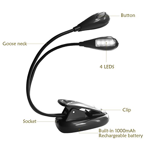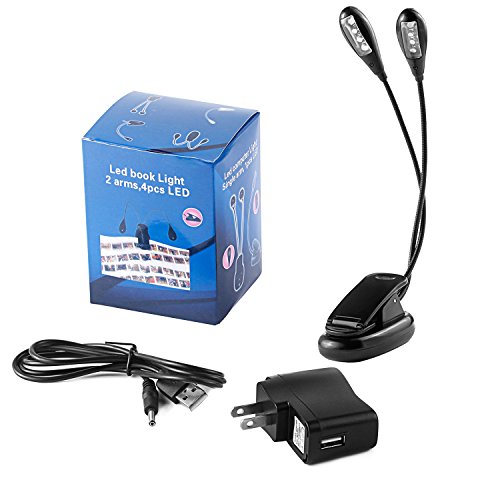 Reading Lights For Books In Bed , PEMOTech 4 LED Clip On Reading Light, Portable & Flexible, 2-Level Brightness Rechargeable Travel Light with USB Cable & AC Adapter for Desk, Music Stand, Bed