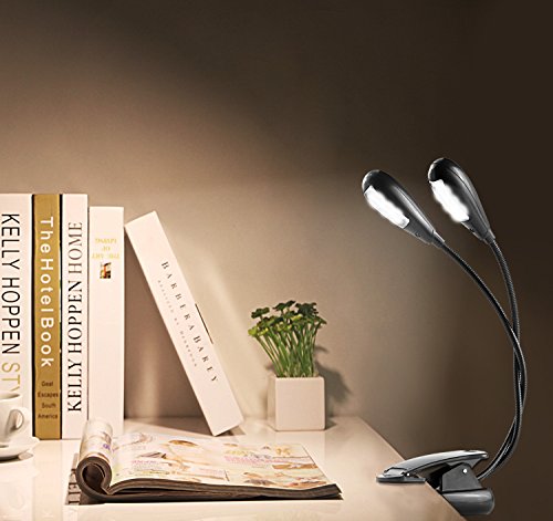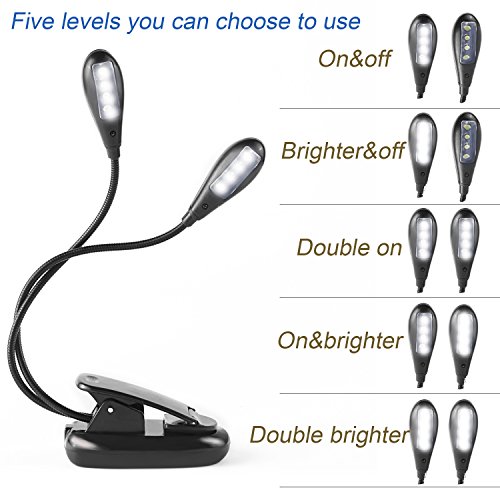 Book Light for Reading In Bed, PEMOTech 8 LED Rechargeable Desk Lamp, Eye-care Reading Light, Dual Head Clip On Travel Light, 5 Level Brightness, Flexible Gooseneck, with AC Adapter and USB Cable