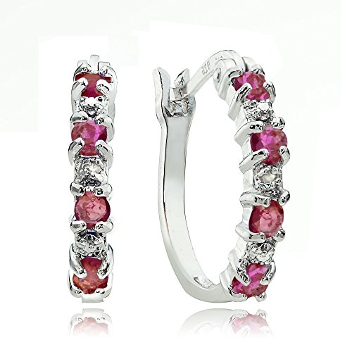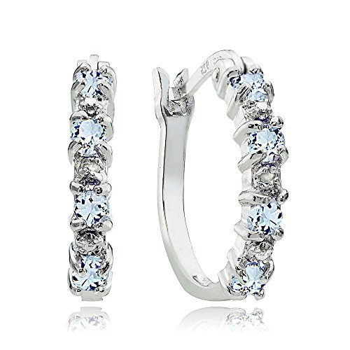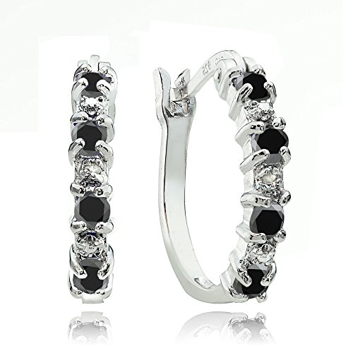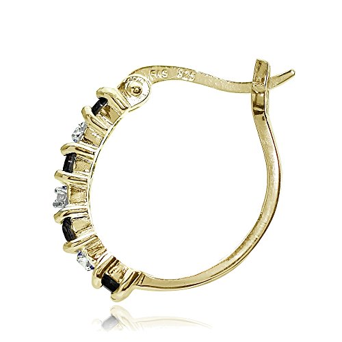 These pretty earrings feature shimmering created black sapphire gemstones and diamond accents set into high polished gold tone flash sterling silver hoops. They are secured by post with snap down clasps.