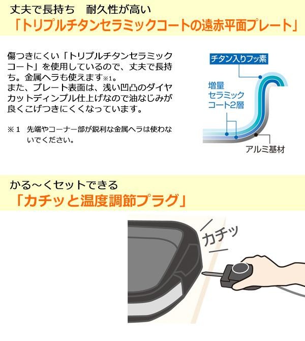 | トリプルチタンセラミックコートの「遠赤平面プレート」ですので、耐久性が高く丈夫で長持ち!!収納しやすいローフォルムで、電源コードは2.5mのロングコードです。 |