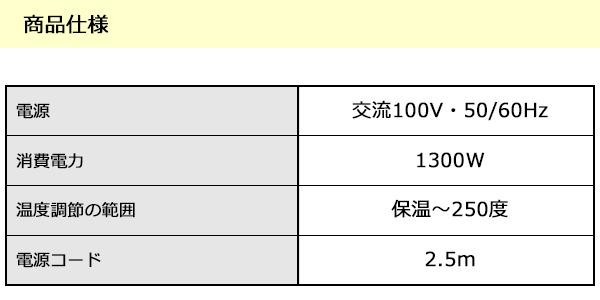 | セット内容 | ふた、本体、平面プレート、電源コード、取扱説明書兼保証書(保証期間:1年間)※取扱説明書に「お料理ノート」ページあり |
