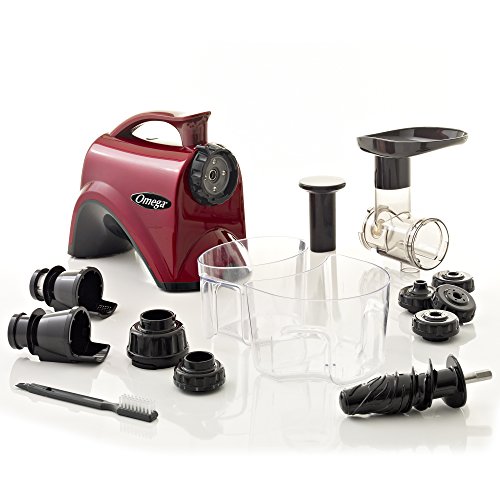 Omega's Nutrition Centers are "masticating-style" juice extracts and more. A masticating juicer juices at low speeds of 80 RPM minimizing heat build-up and oxidation. The auger system forces produce into a tight chamber, grinding and pressing the food to squeeze out the juice from items as fine as wheatgrass and leafy vegetables. With a Nutrition Center you can also make all-natural nut butters, baby food, soy milk, almond milk and a variety of healthy snacks. Includes 6 nozzles and 2 Juicing screens.Feature