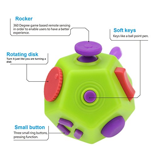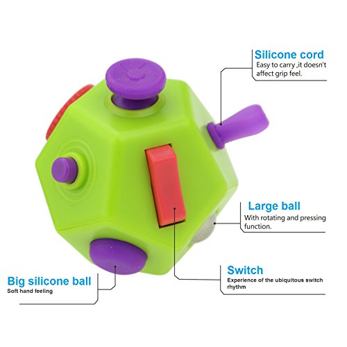Fidget Dodecagon has 12 sides with each side featuring something different to fidget with: ●Gear - 3 gears can be rolled back and forth. It is to be poked and rolled with voice of clarity and harmony. ●Rotating Disk - Disk can be clicked and turned in any direction. Turn it just like you are turning a disk. ●Button - Gamepad controller buttons experience Silicone Ball - It is resilient and can be pulled and pinched freely. ●Silicone ball-Soft and exquisite hand feeling, resilient. ●Joystick - You don't have to be a gamer to enjoy the gliding action. ●Switch - Pivot it back and forth and make you feel like turning on and off something ●Soft Rope - It is retractable and can hung anywhere. ●Click - With it you don't need to click that pen anymore. ●Finger Massage - The tactility of the surface has the function of improving blood circulation and massage. ●Worry Stone - Use your fingers to rub it repeatedly and it can relieve stress and annoyance effectively. ●Sliding Blocks - Sliding blocks to adjust your own life rhythm. ●Minions - The little faces are cute. They won't get angry no matter how you pinch them.