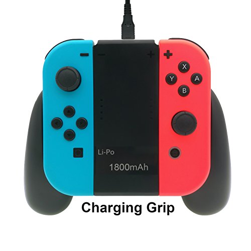 -. Feature : GOOD TACTILITY - The product applies to Nintendo Switch Joy Cons.Combine the left and right Joy-Con into one larger controller with this handy grip.Use intelligent microcomputer control technology with protection circuit. / CHARGING WHILE PLAYING - You can hold and charge two joy-cons simultaneously while playing games.High efficiency conversion output,high energy polymer lithium battery core storage. / ENOUGH POWER BANK - 1800mAh charger. You can charge this from a wall outlet or PC USB port.Charging grip includes a Micro USB cable.It can supply power for the right&left Joy-Con at the same time. / INDICATOR STATUS INDICATION - Charging:Long flashing red light,Full Charged:Red light,Discharge:Green light,Long power:Long flashing green light. / Certified Safe - MultiProtect safety system ensures complete protection for your Nintendo Switch Joy Cons.If you don't want to charge your joy cons,please take out your joy cons and wait for several seconds then the light will turn off automatically.