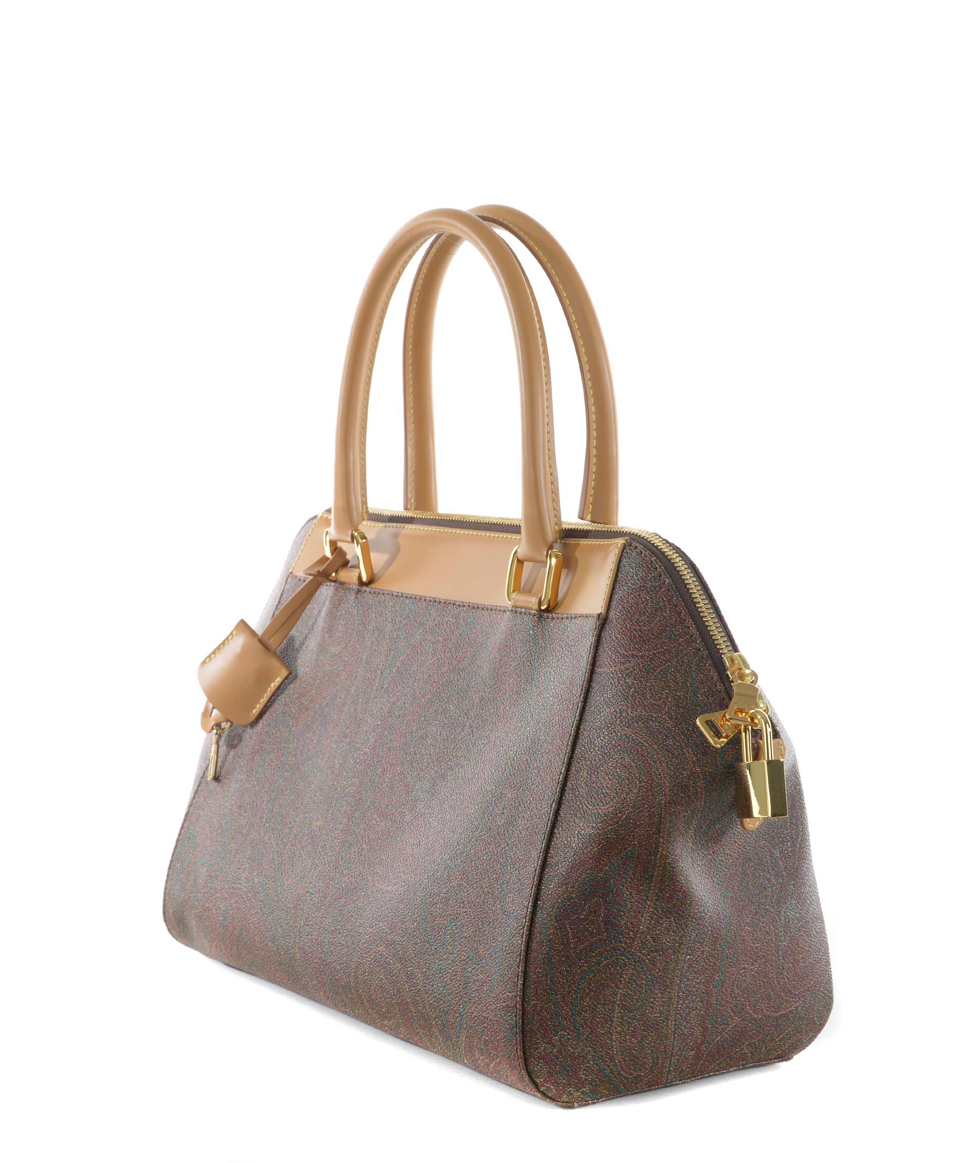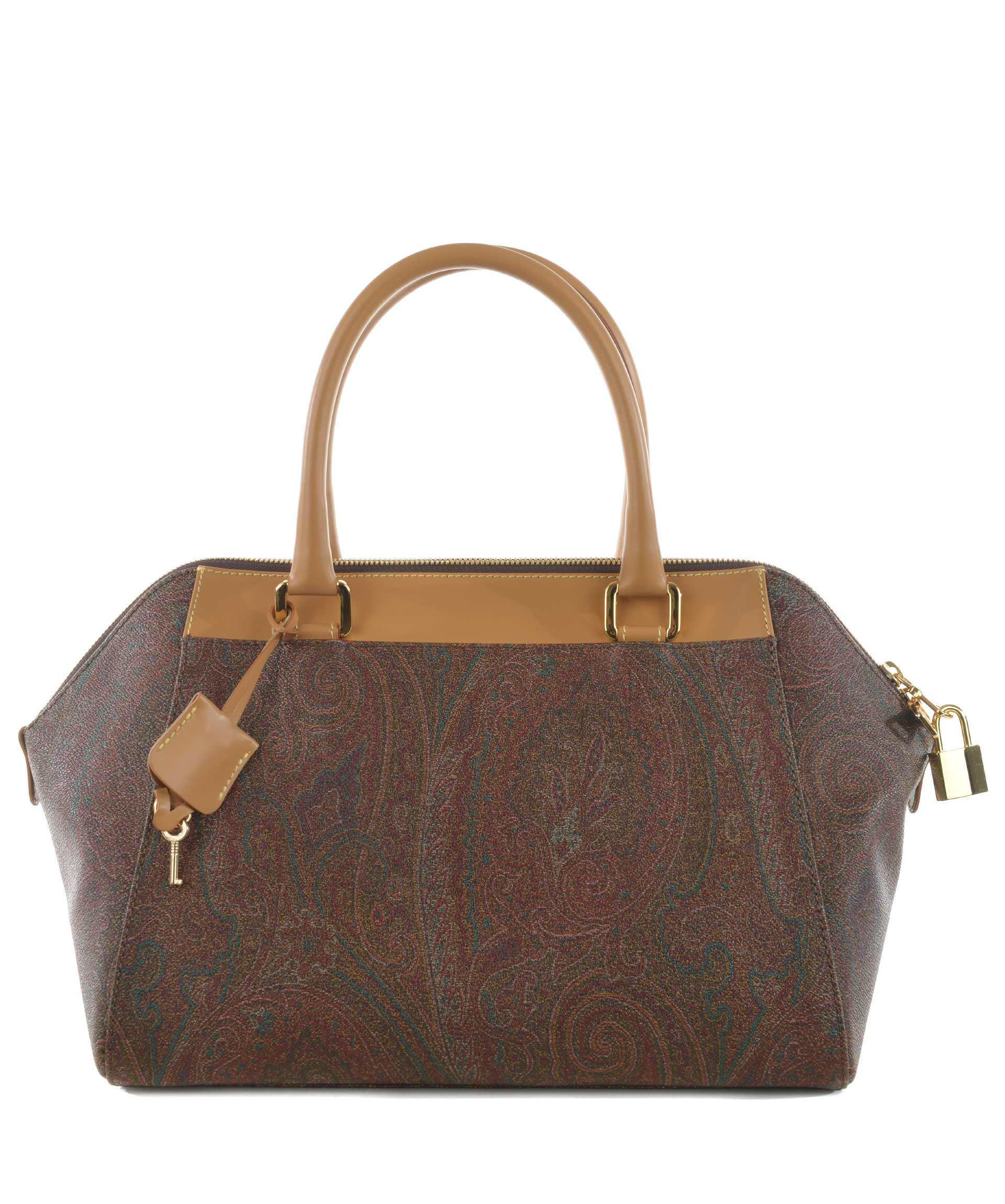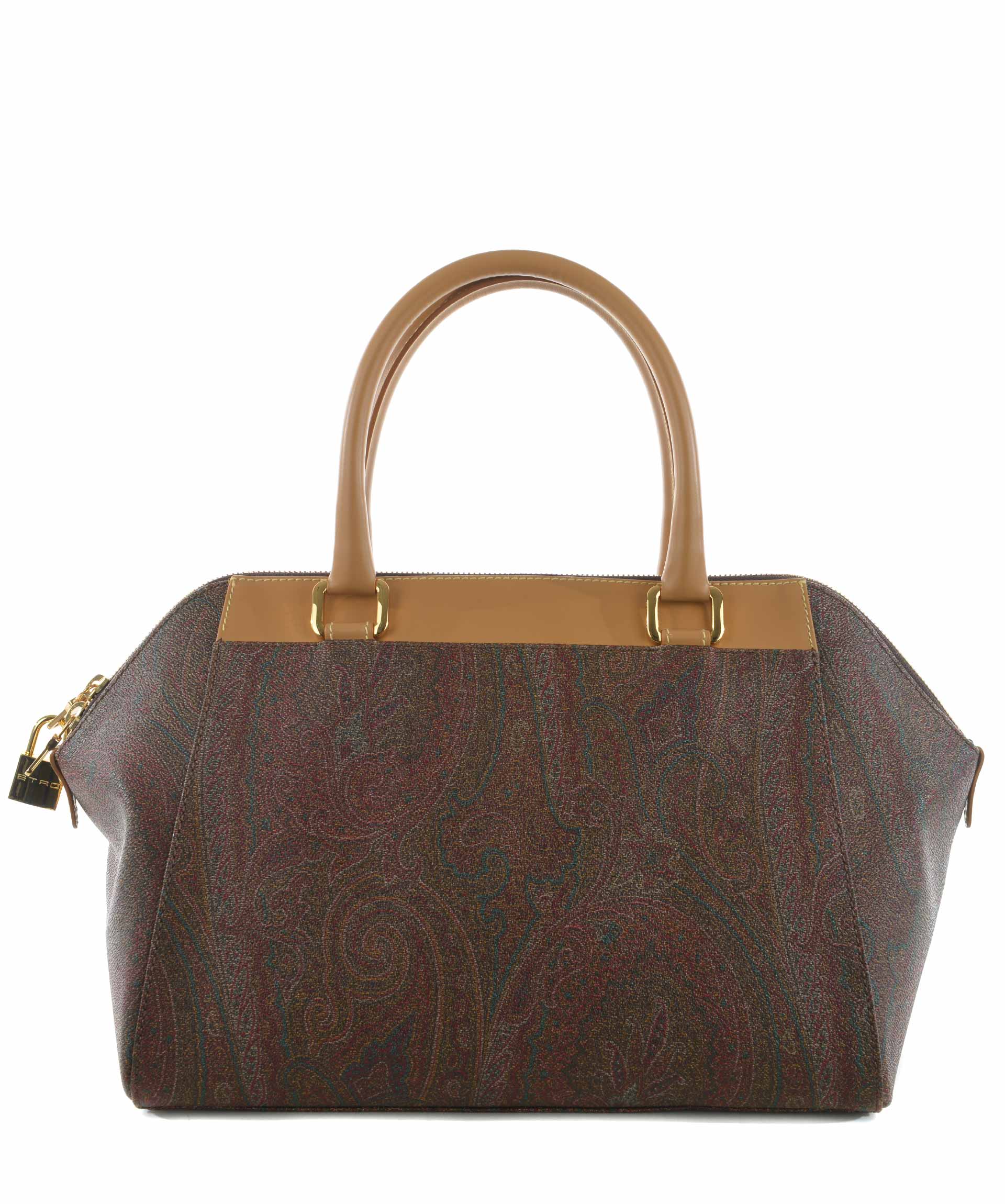 Bauletto Etro in tela jacquard spalmata stampa paisley Multicolor. Inserti in pelle cammello. Due manici semirigidi in pelle. Chiusura con zip doppio cursore e lucchetto. Tasca interna con zip e tasche applicate. Foderata. Piedini metallici alla base. Finiture in metallo dorato.