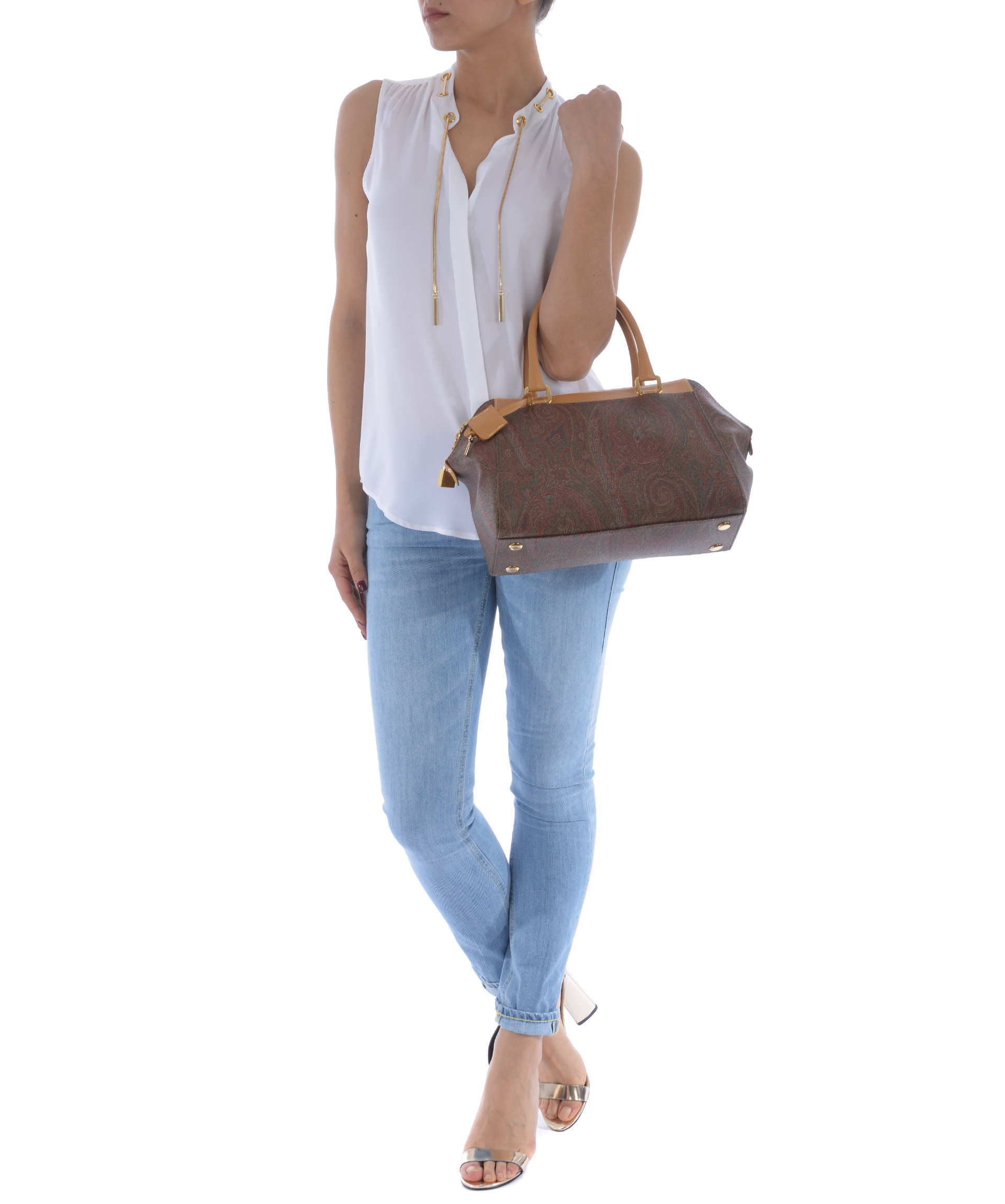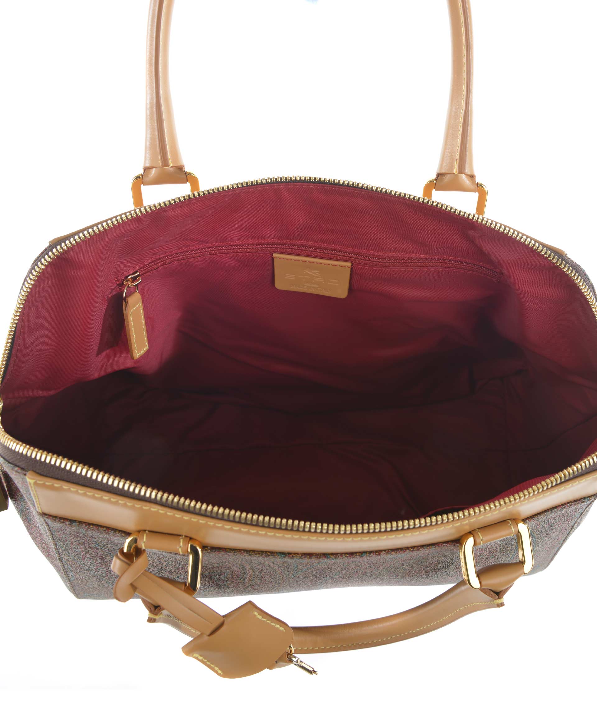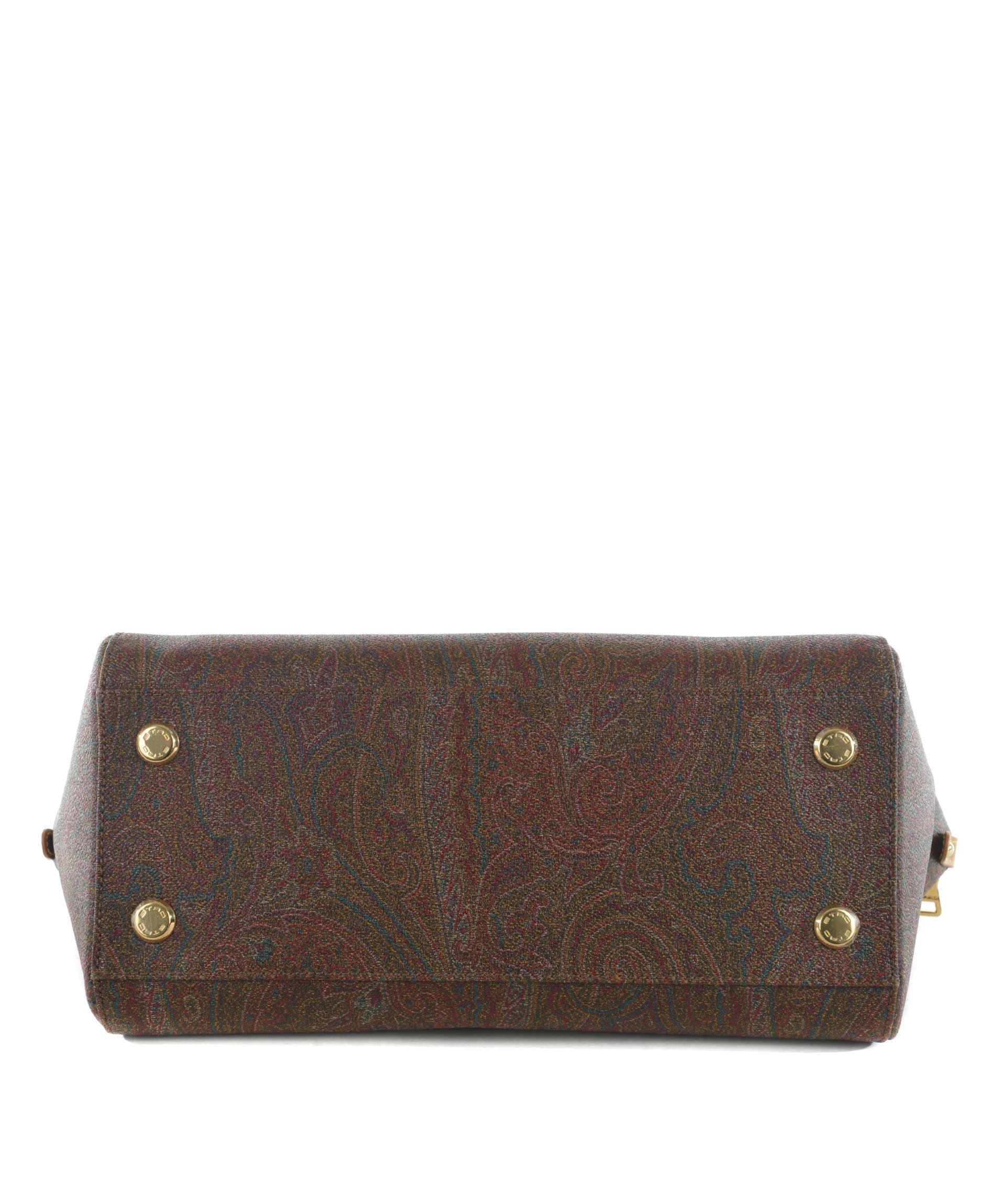 Bauletto Etro in tela jacquard spalmata stampa paisley Multicolor. Inserti in pelle cammello. Due manici semirigidi in pelle. Chiusura con zip doppio cursore e lucchetto. Tasca interna con zip e tasche applicate. Foderata. Piedini metallici alla base. Finiture in metallo dorato.