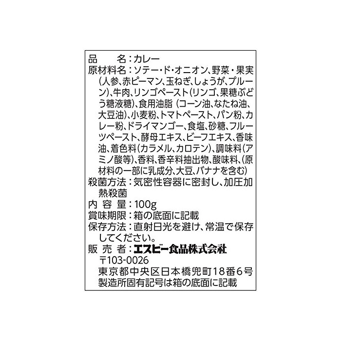 원재료:소테 드 오니(귀신) 온,야채 과실((당근)인삼,적피망,옥파,하 # 것이지만,Pull《―》)고, 쇠고기,사과 Paste(사과,과당 포도당액당)고, 식용유지(콘유,이군요 유,대두유)고, 소맥분,토마토 Paste,빵가루,카레분,드라이 망고,식염,설탕,후루츠 Paste,효모 엑기스,비프 엑기스,향기 맛유,착색료(카라멜,카로텐)고, 조미료(아미노산등)고, 향료,향신료 추출물,신맛료,(원재료의 일부에 유성분,대두,바나나를 포함한다)