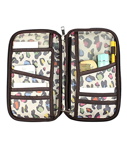 - Feature : Zippered passport and travel document organizer with a fun, colorful leopard print organizes all travel documents in one place / Large exterior pocket is perfect for passports, plane tickets, and other travel documents that you need to keep on hand / Interior features a zippered pocket and a pencil holder / Numerous interior pockets and slots (10) for your I.D., credit cards, passports, valuables, money, travel documents, and other on-the-go travel necessities / Money back satisfaction guarantee